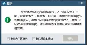 ? 在2020年12月31日前,非湖北省小規(guī)模納稅人(含轉(zhuǎn)登記納稅人)每日次登錄開票軟件,系統(tǒng)提示內(nèi)容變更為“按照財(cái)政部和稅務(wù)總局規(guī)定,2020年12月31日前,除湖北省外,其他省、自治區(qū)、直轄市的增值稅小規(guī)模納稅人,適用3%征收率的應(yīng)稅銷售收入,減按1%征收率征收增值稅。請(qǐng)您準(zhǔn)確選擇適用征收率開具增值稅發(fā)票。