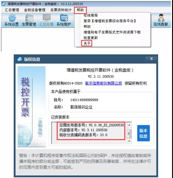 進(jìn)入開票軟件,點(diǎn)擊【幫助】--【關(guān)于】,查看版本,開票軟件版本為:V2.0.38_ZS_20200530,稅收分類編碼表版本為35.0