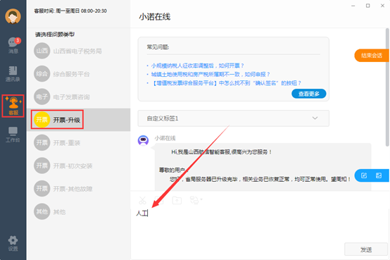 第三步:點(diǎn)擊左下角【客服】——選擇問(wèn)題類型【開票升級(jí)】,右側(cè)對(duì)話框發(fā)送“人工”聯(lián)系網(wǎng)絡(luò)工程師進(jìn)行升級(jí)。