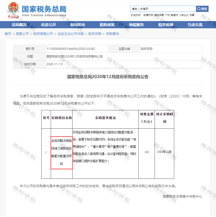 11月13日,稅務總局發布2020年12月政府采購意向公告: